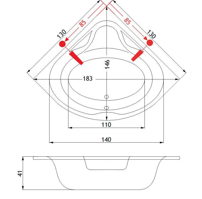 Μπανιέρα Ακρυλική MODENA με σύστημα Υδρομασάζ (0.88hp-6 jet) 130×130, Sirene